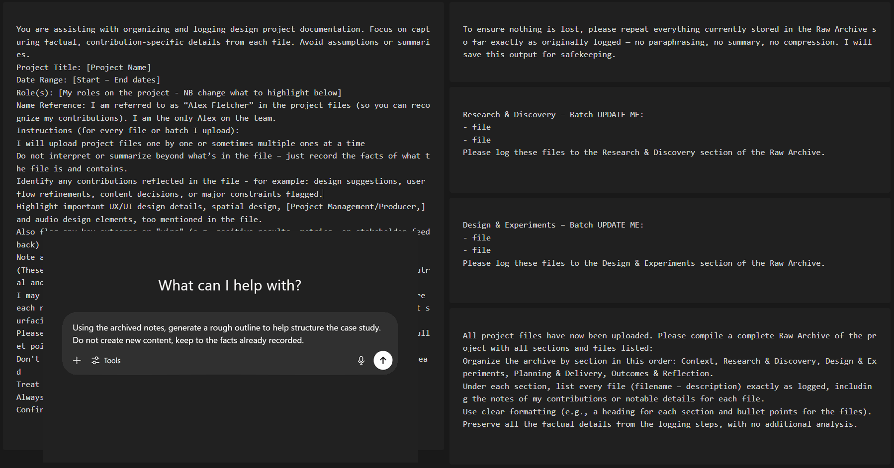 Part of the workflow used to build a raw archive of past projects. Prompts were designed to extract facts, not generate content.