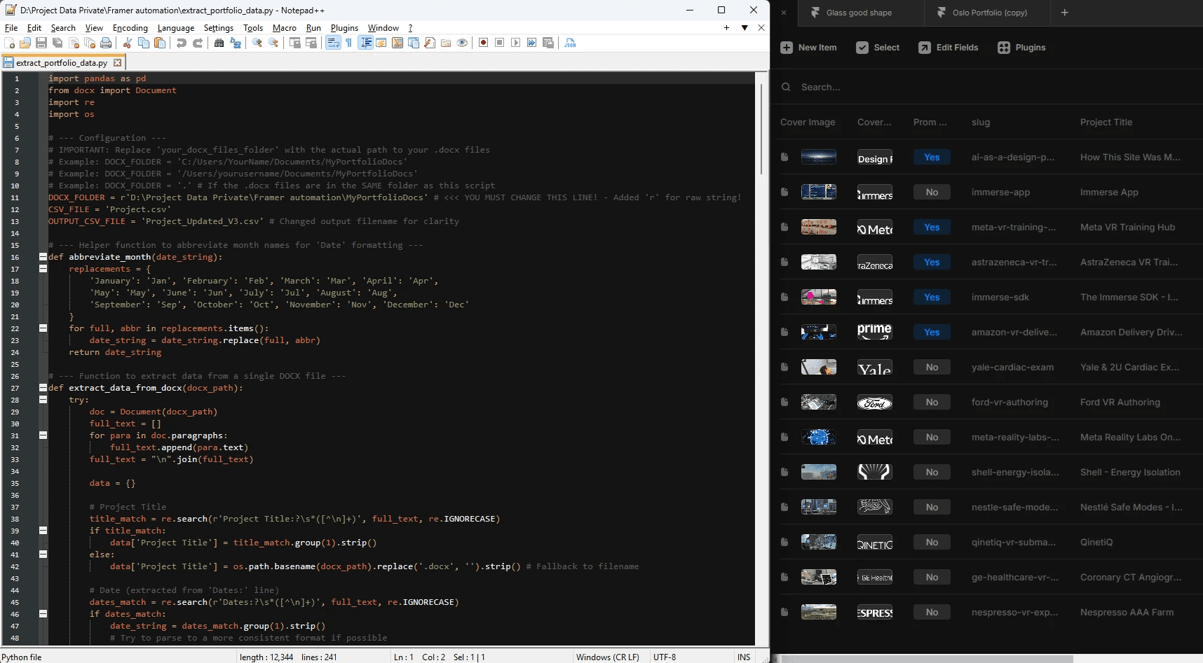 Once the project case studies were completed in documents, I set about populating the CMS (in Framer). I noticed that plugins were available to export and import the CMS data, and I wondered if I could automate the process, even just to get the data in. I was learning Framer on the fly and needed to save time wherever I could. Using ChatGPT I built a lightweight Python script that parsed my .docx case study files and outputted CMS-ready CSV data.