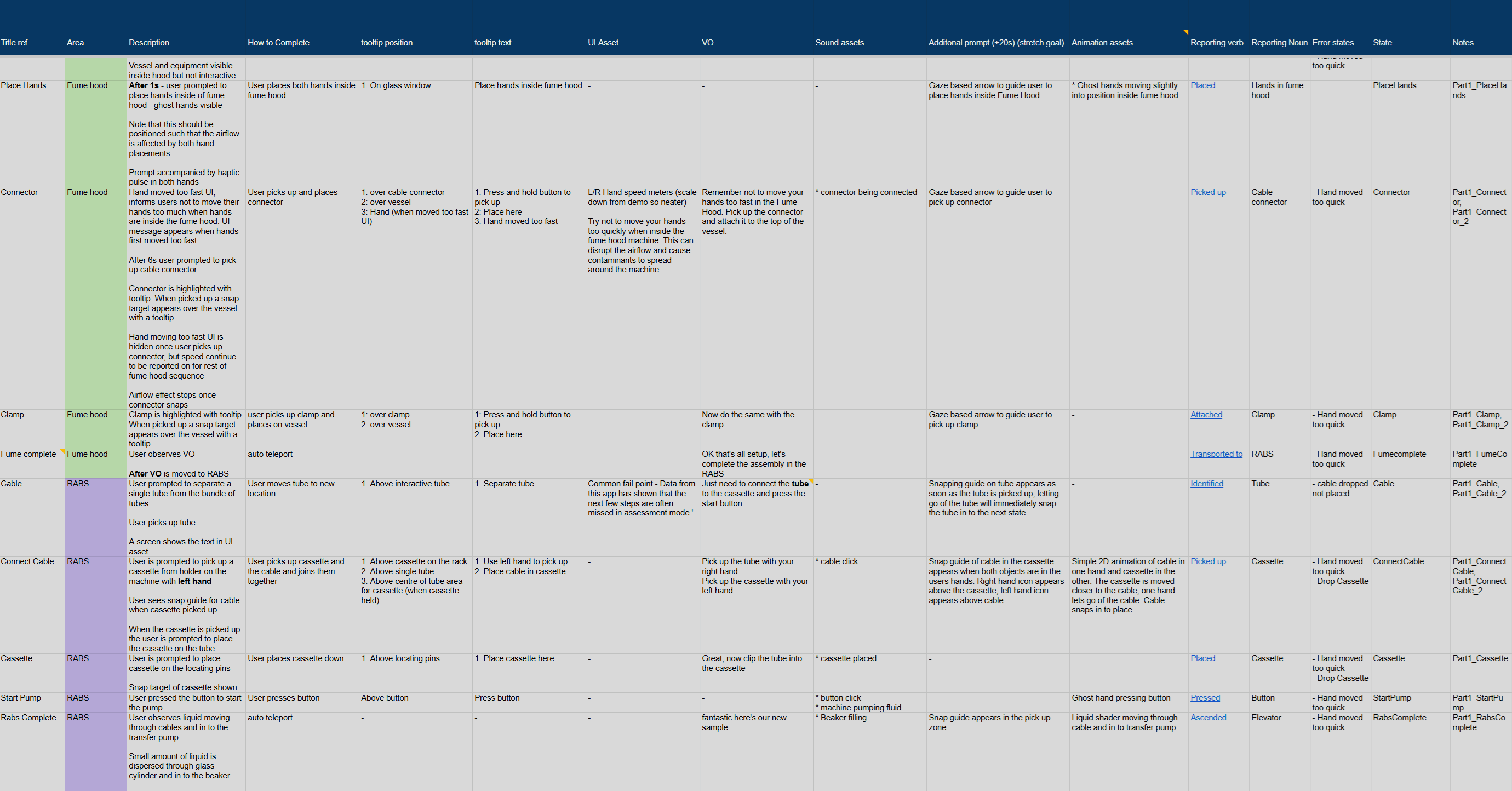 I mapped every interaction into a spreadsheet-based state machine, defining expected states, success conditions, and error handling. These flows drove everything from VO cue timing to controller mappings and system prompts. We modeled room layouts and teleport paths in Shapes to validate environmental layouts and ensure key interactions held up ergonomically.