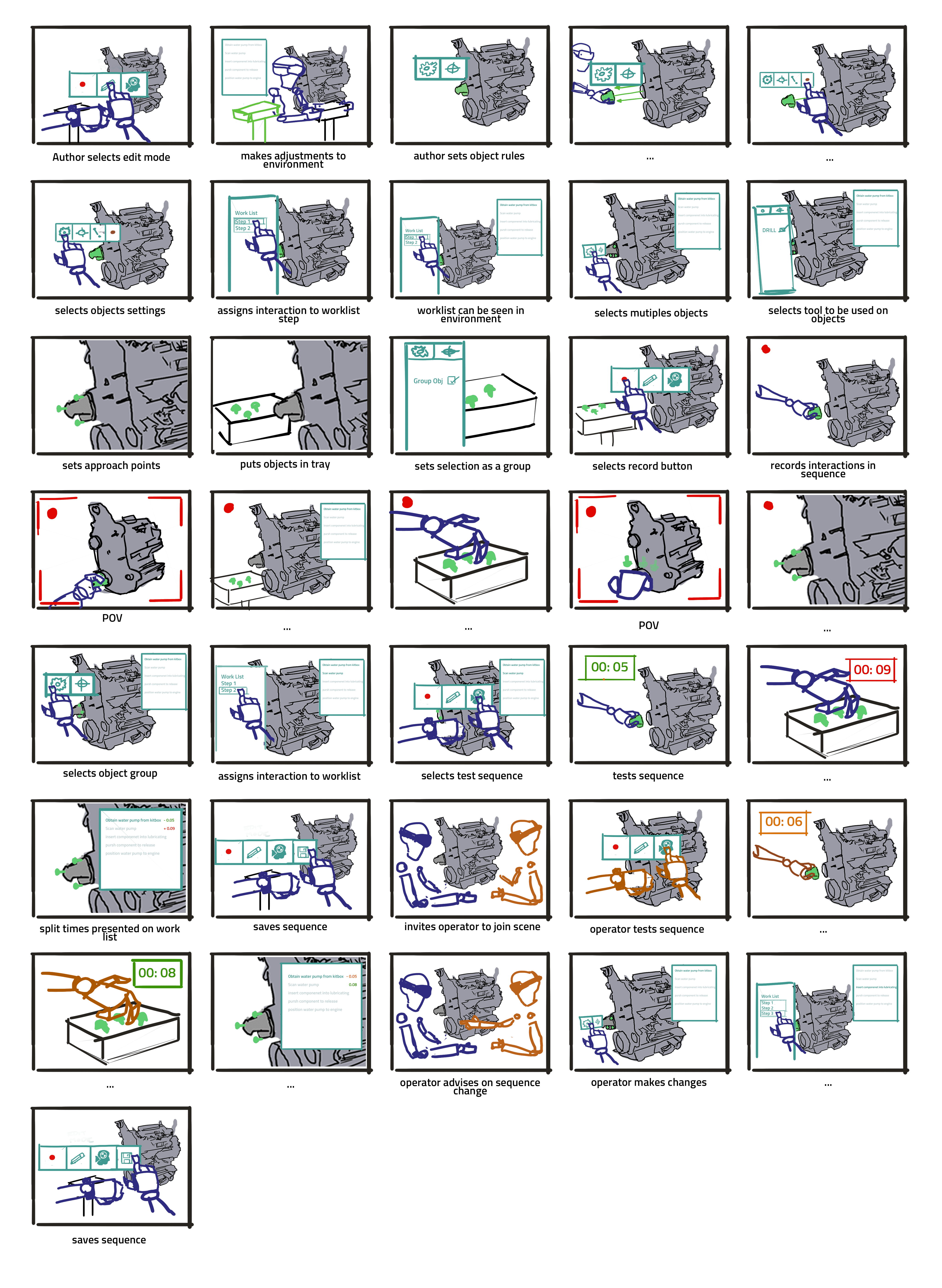 I mapped out the training scenarios Ford wanted to model first. We considered the triggers and conditions that accompanied the required user actions, forming the core UX. Another core UX aspect was the assumption that the CAD models would start in a 'completed' state (in their final form).