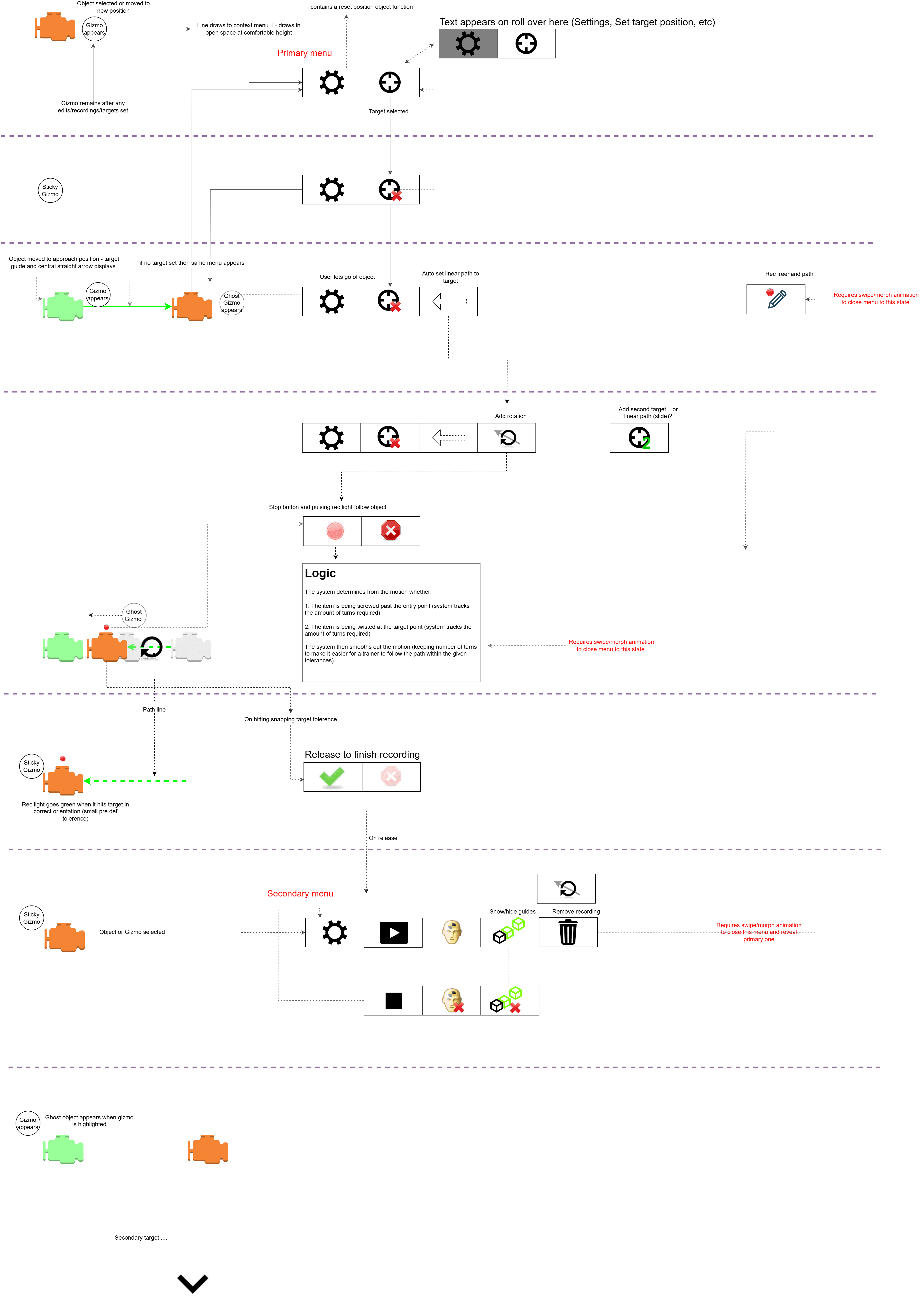 Early menus prohibited ease-of-use when setting up the sequences in VR. I iterated to design a contextual menu system that attached to objects, giving the user quick access to tools to enable them to do things like record paths and orientations. This removed the sequencing logic from this step and reduced the initial work required by the user to begin. For path setting logic, I used a nodal system where authors could physically draw lines between objects, and a freehand system for more nuanced interactions.